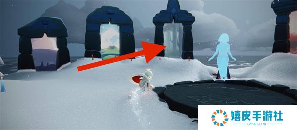 3、即可到达集结季地图,往左前方飞,进入三扇门中间的木头门。