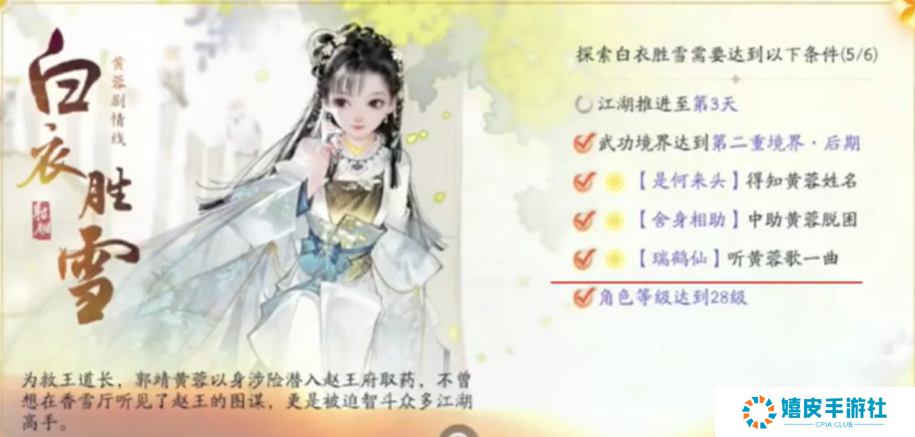 射雕手游攻略大全 射雕第六章选郭靖还是黄蓉 答: 轻剑重剑玩家选择:黄蓉 护手棍子玩家选择:郭靖 选项推荐 一、黄蓉(白衣胜雪) 1、选择黄蓉线玩家将获得:重剑、轻剑的心法奖励。 2、探索黄蓉线条件:江湖推进第三天、武功境界达到第二重境界后期,【是何来头】得知黄蓉姓名、【含身相助】中助黄蓉脱困、【瑞鹤仙]】听黄蓉歌一曲、角色等级达到28级。