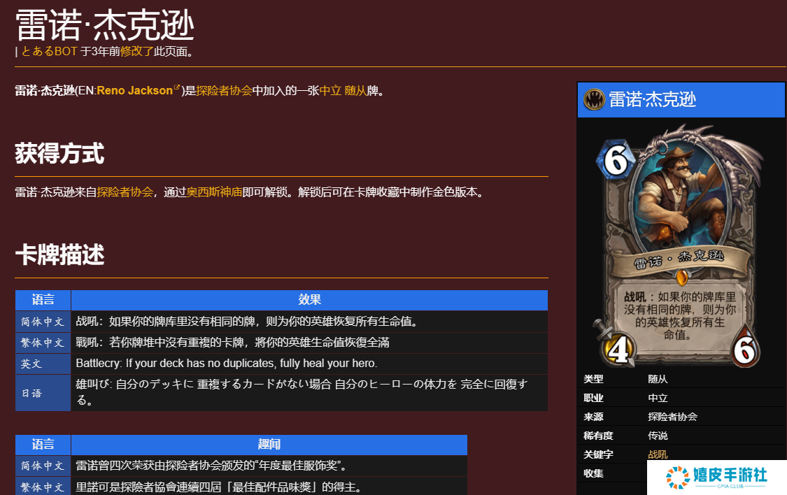 雷诺杰克逊是炉石传说游戏中的一张卡牌,但仍有很多玩家不知道雷诺杰克逊怎么获得,通关探险者协会冒险模式中的【奥西斯神庙】区域即可获得,小编为大家整理了详细的介绍,感兴趣的玩家千万别错过了!