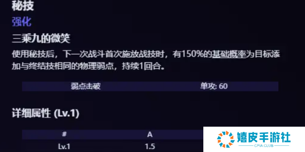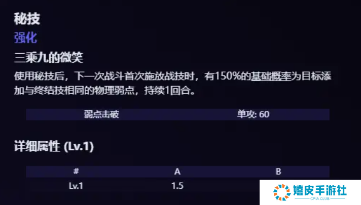 五、秘籍(强化)-三乘九的微笑 解析:使用秘技之后在下一次释放战技之后,会为目标添加物理弱点会持续一个回合。