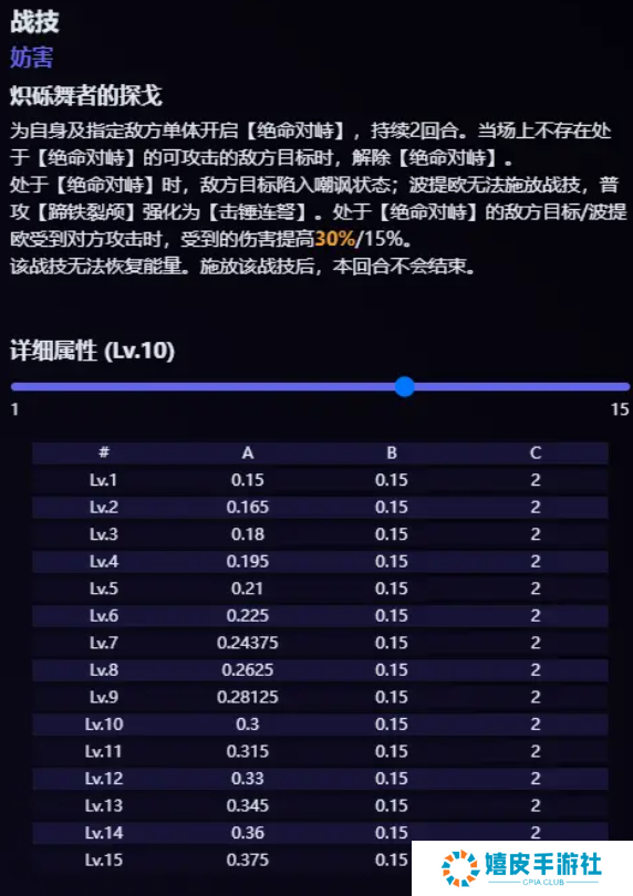 二、战技(妨害)-炽砾舞者的探戈 解析:持续两个回合对目标单体开启了【绝命对峙】效果,在【绝命对峙】状态敌人陷入到嘲讽状态,是无法释放战技的。