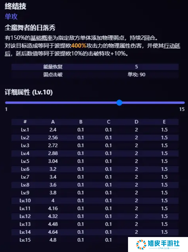 三、终结技(单攻)-尘魔舞者的日落秀 解析:指定敌人单体来增加物理弱点持续两个回合,对目标敌人可以提高百分之四百的物理攻击伤害值。