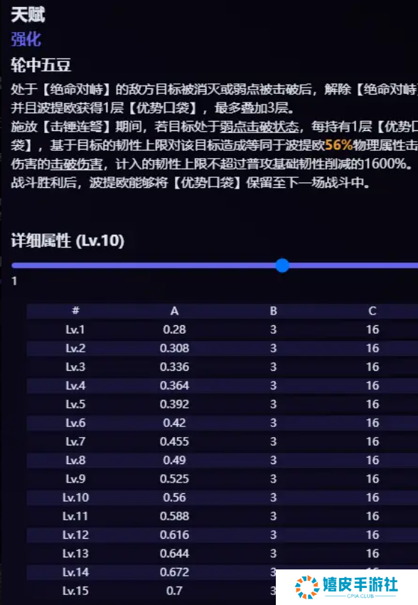 四、天赋(强化)-轮中五豆 解析:在【绝命对峙】状态中敌人目标会被消灭之后就会解除【绝命对峙】,最多可以叠加三层的【优势口袋】。