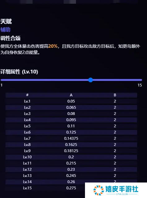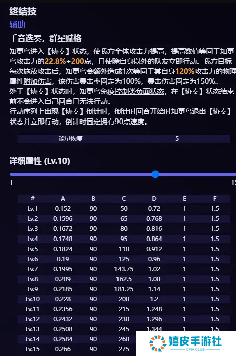 四、天赋(辅助)-调性合颂 解析:让全队成员暴击伤害值直接提高百分之二十,在攻击目标敌人的时候知更鸟会额外回复自身的2点能量。