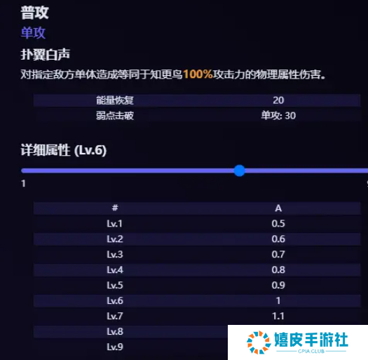 崩坏星穹铁道知更鸟技能爆料 一、普攻(单攻)-扑翼白声 解析:普攻技能可以指定敌方对其造成同于知更鸟百分百物理属性的攻击伤害效果,能量恢复是20;