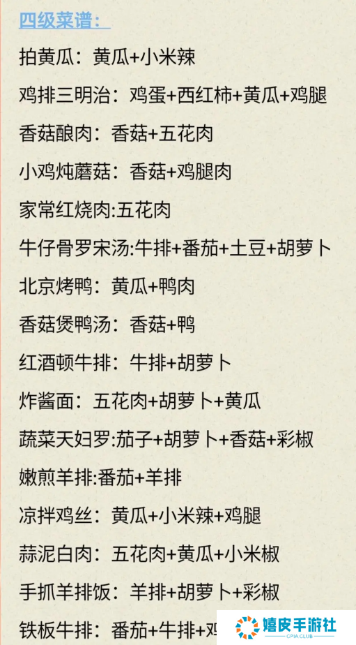 四级菜谱 拍黄瓜=黄瓜+小米辣 鸡排三明治=鸡蛋+西红柿+黄瓜+鸡腿 香菇酿肉=香菇+五花肉 小鸡炖蘑菇=香菇+鸡腿肉 家常红烧肉=五花肉 牛仔骨罗宋汤=牛排+番茄+土豆+胡萝卜 北京烤鸭=黄瓜+鸭肉 香菇煲鸭汤=香菇+鸭 红酒顿牛排=牛排+胡萝卜 炸酱面=五花肉+胡萝卜+黄瓜 蔬菜天妇罗=茄子+胡萝卜+香菇+彩椒 嫩煎羊排=番茄+羊排 凉拌鸡丝=黄瓜+小米辣+鸡腿 蒜泥白肉=五花肉+黄瓜+小米椒 手抓羊排饭=羊排+胡萝卜+彩椒 铁板牛排=番茄+牛排+鸡蛋