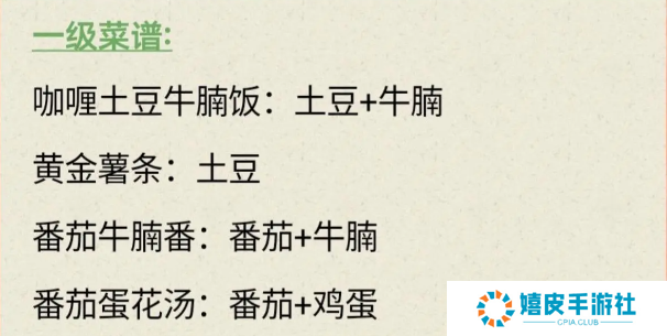 我的休闲时光攻略 我的休闲时光攻略 热门攻略 菜谱 官网预约 上线时间 兑换码 二级料理菜谱 菜谱大全 一级菜谱 咖喱土豆牛腩饭=土豆+牛腩 黄金薯条=土豆 番茄牛腩番=番茄+牛腩 番茄蛋花汤=番茄+鸡蛋