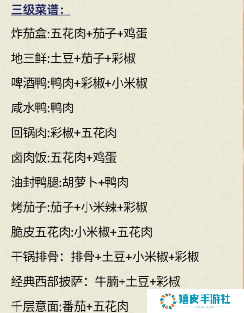 三级菜谱 炸茄盒=五花肉+茄子+鸡蛋 地三鲜=土豆+茄子+彩椒 啤酒鸭=鸭肉+彩椒+小米椒 咸水鸭=鸭肉 回锅肉=彩椒+五花肉 卤肉饭=五花肉+鸡蛋 油封鸭腿=胡萝卜+鸭肉 烤茄子=茄子+小米辣+彩椒 脆皮五花肉=小米椒+五花肉 干锅排骨=排骨+土豆+小米椒+彩椒 经典西部披萨=牛腩+土豆+彩椒 千层意面=番茄+五花肉