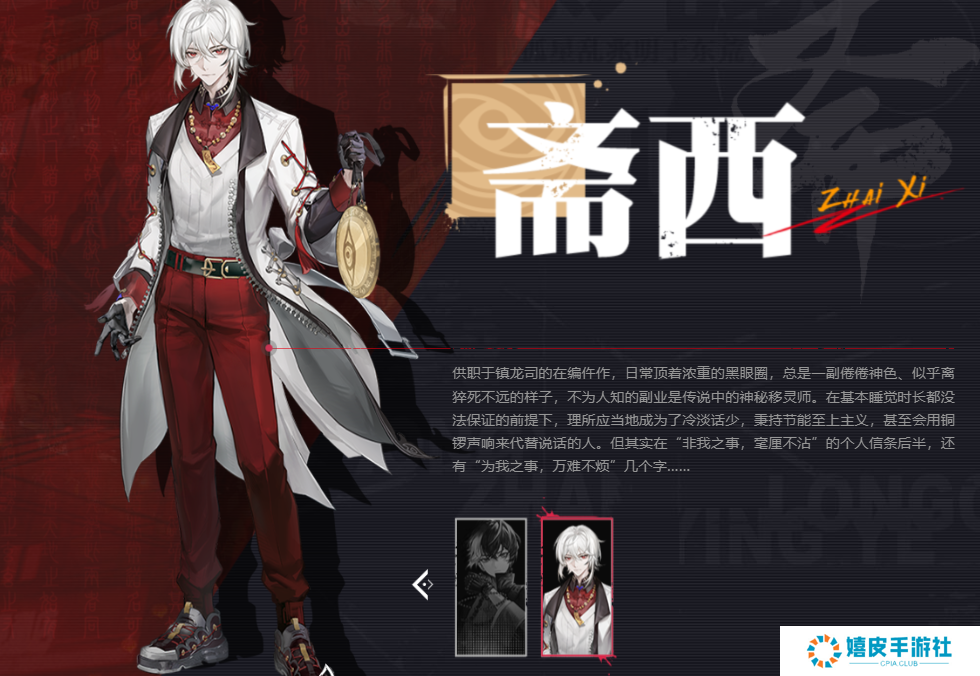 十一、斋西 人物介绍 1、斋西供职于镇龙司的在编仵作,冷淡话少。 2、总是一副倦倦神色的样子,但本人是传说中的神秘移灵师。