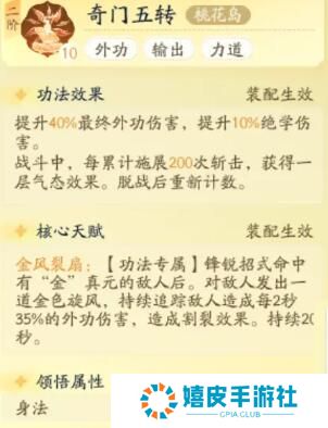 功法介绍 1、桃花岛-奇门五转 功法效果可以提升40%的外功伤害,提升10%的绝学伤害。