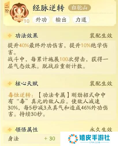 2、白驼山-经脉逆转 可以提升40%的外功伤害,提升10%的绝学伤害,累积100次劈击可获得气态效果。