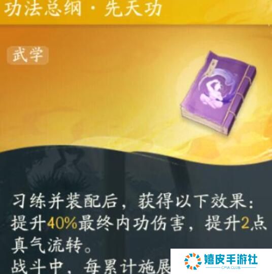 3、先天功 提升40%的最终内功伤害,提升2点真气流转。