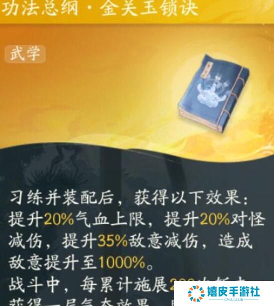 4、金关玉锁诀 可以提升20%的气血上限,提升20%对怪的减伤。