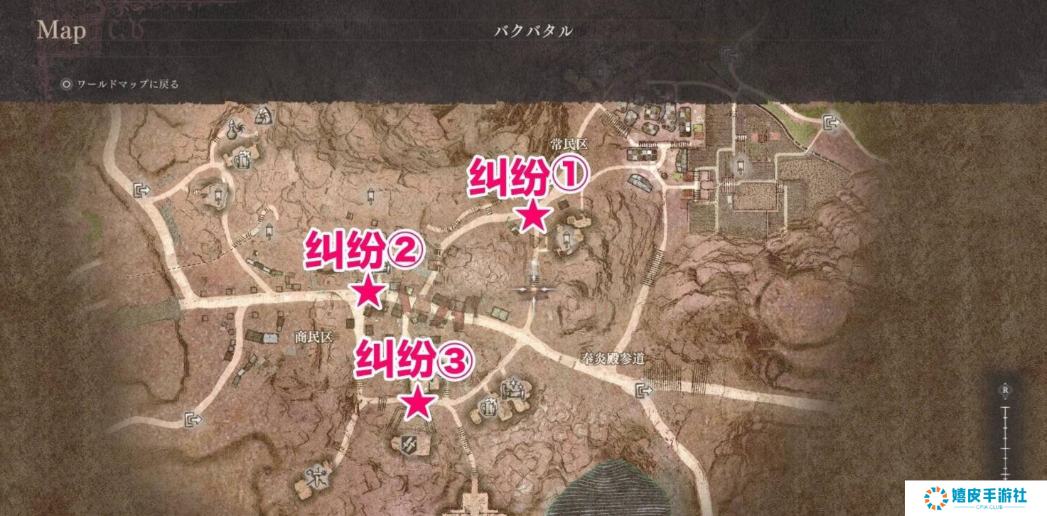 2、然后玩家需要去解决三场纠纷,纠纷位置如图所示;