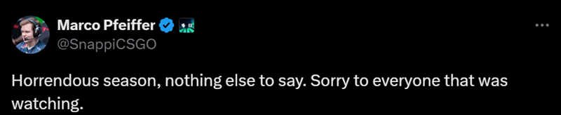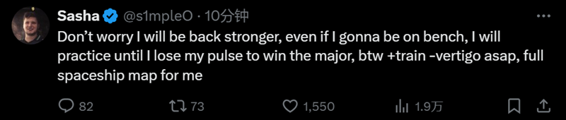 “别担心,我会回来的,即使我被下放,我也会努力训练,直到我失去脉搏,赢得Major的那一天。另外尽快用Train取代Vertigo,这才是我可以完全施展的地图。” Snappi:“糟糕的赛季,除此之外没什么好说的。向观看比赛的人说声抱歉。”
