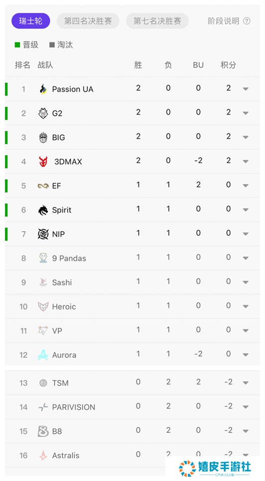上海Major欧洲RMR B组首日比赛已经结束,在首日两轮比赛中, G2携手 BIG晋级2-0组,而 Passion UA和 3DMAX则是以黑马之姿同样来到2-0组; Spirit在第二轮比赛中不敌Passion UA掉入1-1组,没有阿汤哥的 Astralis非常遗憾已经遭遇两连败,濒临淘汰。以下为今日赛果、明日预告和积分榜一览。 今日赛果:  上海Major欧洲RMR B Spirit   B8 G2   NIP VP   Passion UA EF   Aurora Heroic   PARIVISION Astralis   9 Pandas BIG   Sashi 3DMAX   TSM Spirit   Passion UA NIP   PARIVISION G2   9 Pandas B8   Aurora EF   3DMAX Astralis   Sashi VP   TSM Heroic   BIG 明日预告:  上海Major欧洲RMR B VP   9 Pandas Spirit   Aurora Heroic   NIP EF   Sashi Passion UA   BIG TSM   PARIVISION G2   3DMAX Astralis   B8 积分榜:
