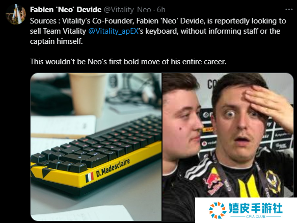 Neo:“据报道,Vitality的联合创始人Neo据称正寻求出售Vitality选手apEX的键盘,而未事先告知队员或队长本人。 这不会是Neo职业生涯中的第一次大胆举动。”
