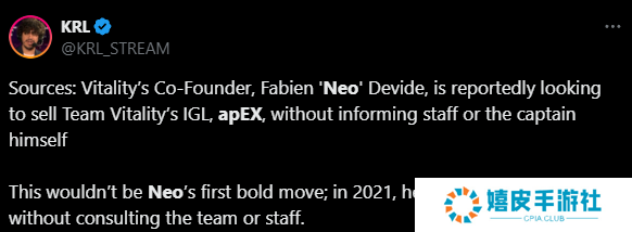 法国爆料人KRL于官推表示, Vitality联合创始人Neo或将考虑出售apEX。