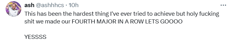 教练ash:“这一直是我尝试实现的最艰难的事情,但天哪,我们连续进入了第四个Major,太棒了!”