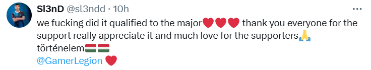 sl3nd:“我们成功了,获得了进入Major的资格,感谢大家的支持,真的非常感激,向所有支持我们的人致以诚挚的爱。”