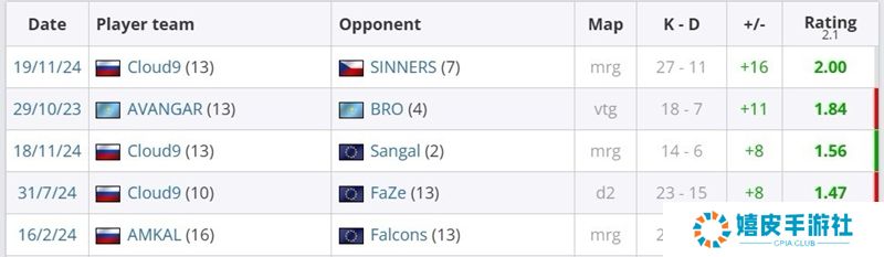 而C9队员ICY在Mirage上打出了优秀的表现:2.00 Rating、27-11 K-D、118.7 ADR,刷新了自己职业生涯的线下赛最佳单图数据。  SINNERSK-DKD差ADRRating  beastik19-14+582.31.10  SHOCK13-13074.70.99  MoriiSko9-17-866.20.79  oskar11-15-457.60.79  majky9-18-955.80.62  C9K-DKD差ADRRating  ICY27-11+16118.72.00  Boombl414-14082.81.25  interz14-11+366.21.18  Ax1Le14-11+373.91.14  HeavyGod7-14-762.90.81 ICY职业生涯中线下赛前五单图数据: