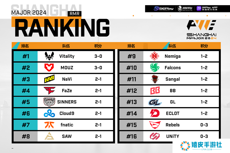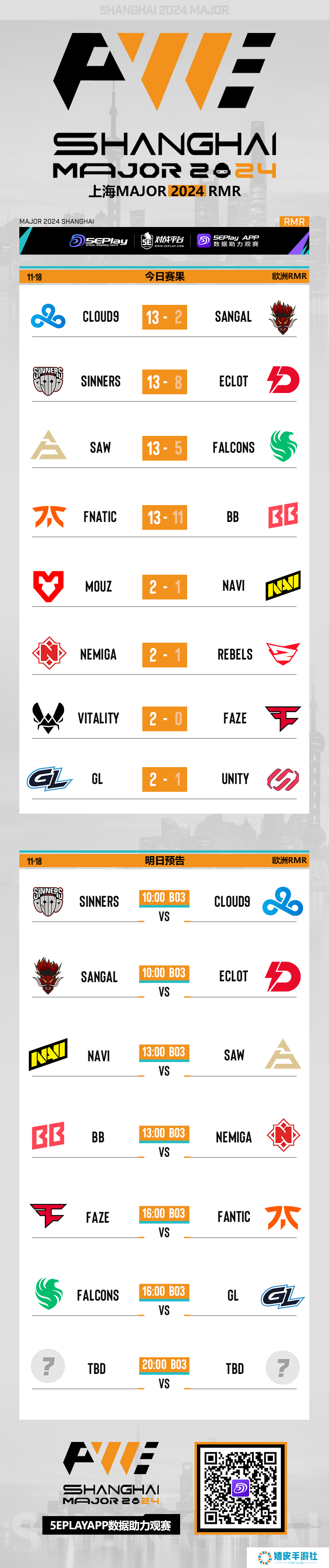 上海Major欧洲RMR A组的第二日比赛也已结束,在今日比赛中,Vitality和MOUZ拿下了前两张进入上海Major正赛阶段的门票,而Natus Vincere和FaZe则还需要一场胜利。SINNERS、C9和fnatic则是位列第5-7位。以下为今日赛果、明日预告和积分图一览。