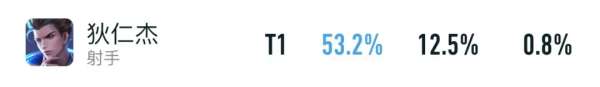 在全分段里,狄仁杰拥有着53.2%胜率+12.5%出场率,综合起来排在了发育路的榜首,已经有重回巅峰的感觉了。