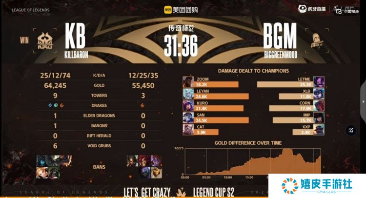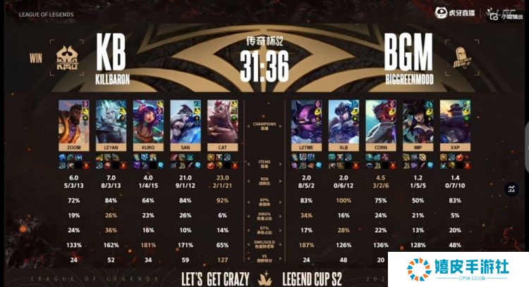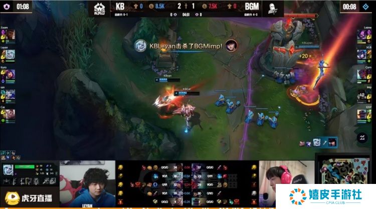 直播吧11月21日讯 老头杯(传奇杯)S2继续小组赛!今天的第二场比赛是Letme带队的BGM(大绿色心情)对阵Leyan带领的KB(男爵克星)! 本场比赛对线期KB多线优势,Leyan佛耶戈拿资源入侵宛如回家,XLB猪妹苦不堪言!12分钟Leyan队就拿下6K经济优势!KB轻松推进压制,虽然BGM高地团连守两波,一度将经济差从12K拉回到6K左右但是无济于事,KB大龙团依靠Kuro妮蔻闪现绕后坐大四个终结比赛!拿下第七胜,常规时间内还没输过!