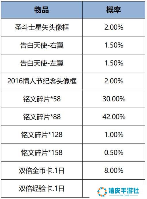 打开后可随机获得以下奖励之一:圣斗士星矢头像框、告白天使-右翼、告白天使-左翼、2016情人节纪念头像框、双倍金币卡:1日、双倍经验卡:1日、铭文碎片x158/128/88/58。