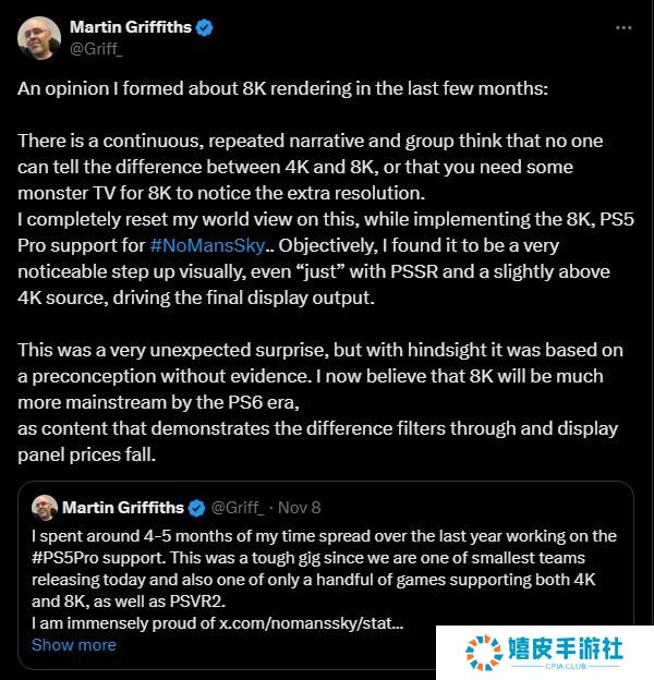 Martin Griffiths首先表示:“这是一项艰巨的任务,因为我们是当今发布游戏中的最小团队之一,也是少数同时支持4K和8K以及PSVR2的游戏之一。” 而Griffiths在潜心开发几个月后,也让他对堪称“群体思维”的“没有人能分辨出4K和8K之间区别”的观点产生了不同的看法,他认为:“我发现这是一个非常明显的视觉提升,即使‘仅仅‘使用PSSR和略高于4K的源,也能驱动最终的显示输出。”