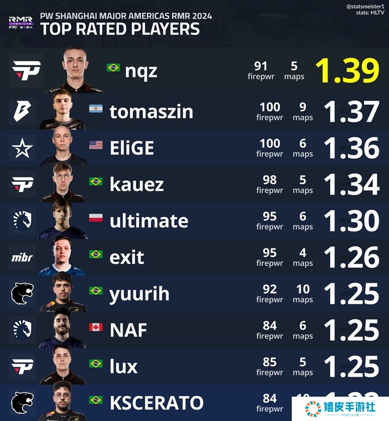 本次美洲RMR中,rating排名第一的是paiN选手nqz,他在5张地图上有着1.39的rating;第二名是BESTIA选手tomaszin,9张地图1.37的rating,遗憾的是这样的发挥也未能帮助队伍晋级,他们最后止步9-11名;第三名是Complexity战队选手EliGE,6张地图1.36的rating凸显一个强大且稳定。