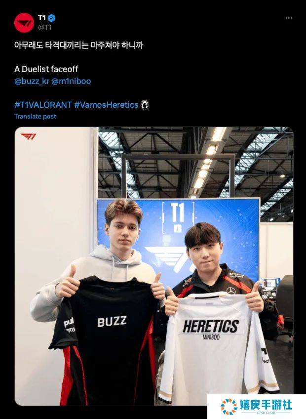 T1官方晒队内BuZz选手与TH战队MiniBoo选手交换队服。