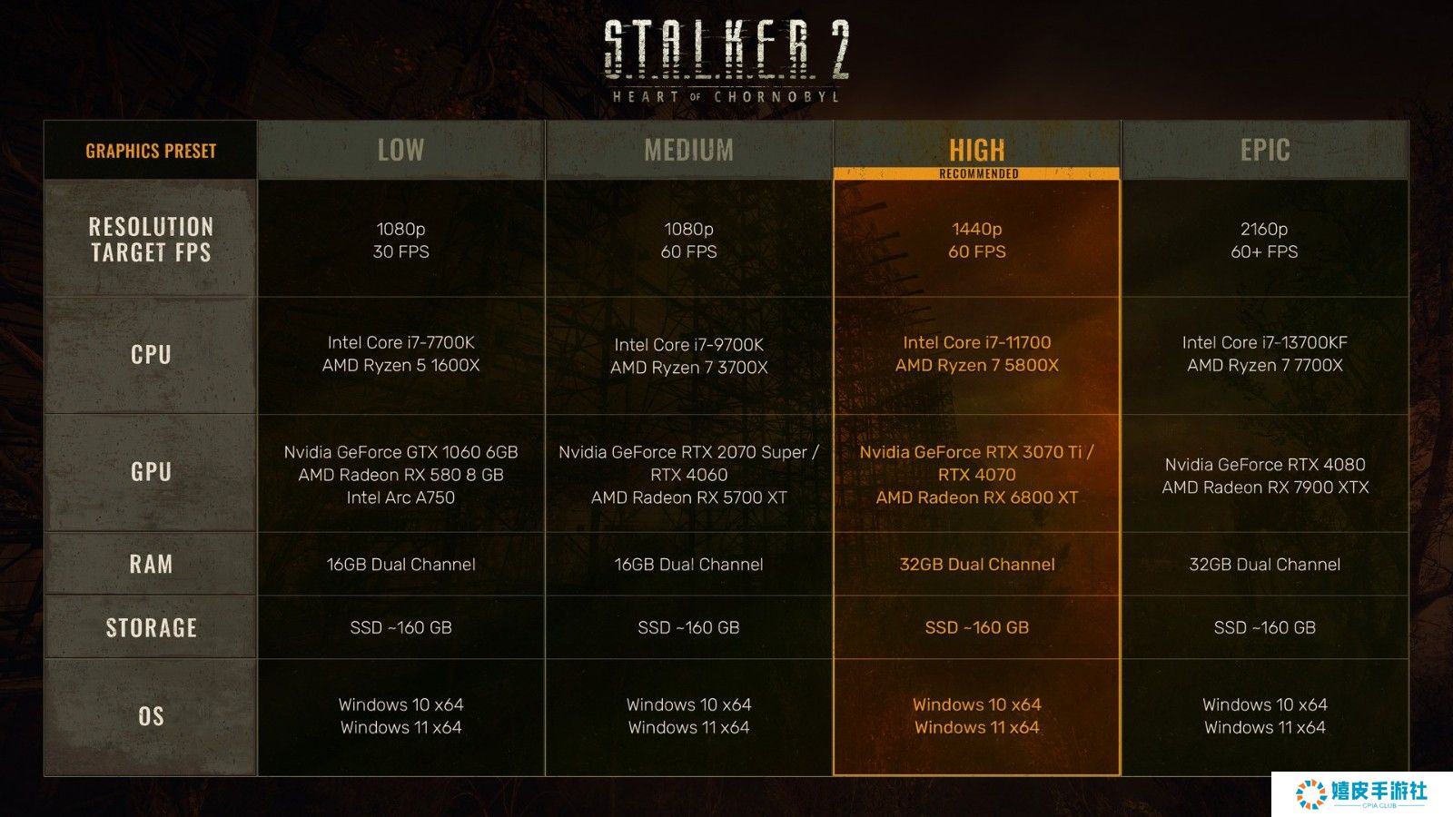 要在1080p/低画质下以30FPS运行游戏,PC玩家需要一台最低配备Intel Core i7-7700K或AMD Ryzen 5 1600X处理器、16GB内存,以及Nvidia GeForce GTX 1060、AMD Radeon RX 580或Intel Arc A750显卡的电脑。 如果要在1080p/中等画质下以60FPS运行游戏,则需要一台最低配备Intel Core i9 9700K或AMD Ryzen 7 3700X处理器、16GB内存,以及NVIDIA GeForce RTX 2070 Super、RTX 4060或AMD Radeon RX 5700XT显卡的电脑。 GSC GameWorld给出的推荐配置为Intel Core i7-11700 或 AMD Ryzen 7 5800X,配备 32GB 内存和 Nvidia GeForce RTX 3070 Ti、Nvidia GeForce RTX 4070 或 AMD Radeon RX 6800XT。基于此配置,玩家能够以1440p/高画质运行游戏,帧率为60FPS。 最后,要实现 4K/超高画质并达到60FPS,玩家需要一台最低配备 Intel Core i7 13700KF 或 AMD Ryzen 7 7700X 的电脑,内存同样为 32GB,并搭载 NVIDIA GeForce RTX 4080 或 AMD Radeon RX7900XTX。 但遗憾的是,这些 PC 配置要求似乎并不代表玩家在原始分辨率下获得的性能。 NVIDIA 分享了一些早期基准测试,其中 RTX 4090 在 原生 4K/极限画质下可以达到 54FPS 左右。要获得高于 60FPS 的帧率,还是需要 DLSS 3。
