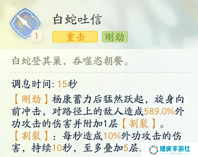 三、杨康武功介绍 1、普攻-白蛇吐信:对敌人造成伤害,并施加割裂debuff。