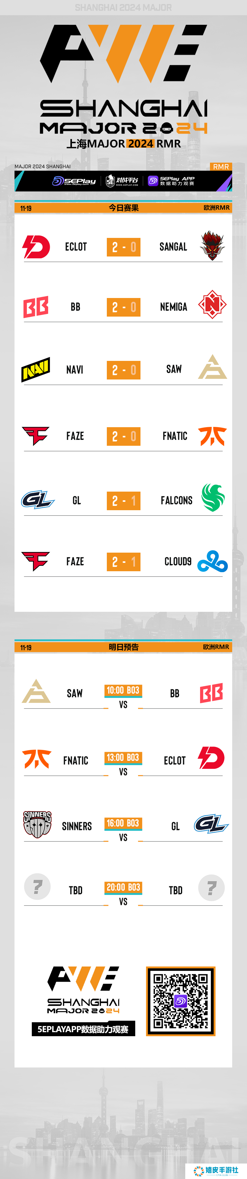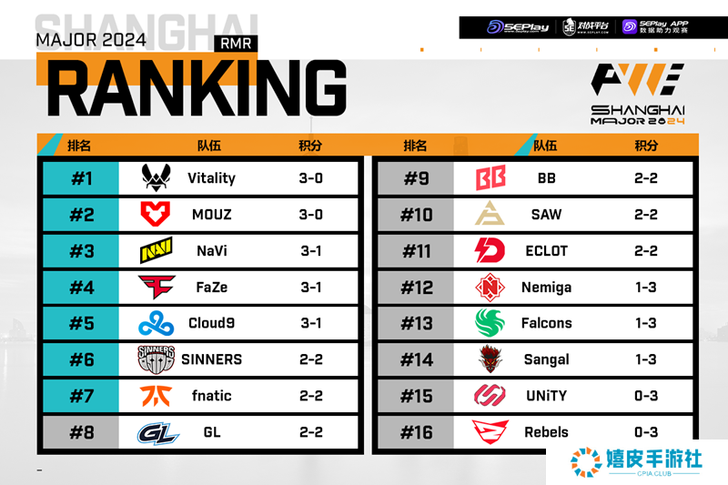 上海Major欧洲RMR A组第三日比赛已经结束,今日四个传奇组名额全部出炉,分别为Vitality、MOUZ、Natus Vincere、FaZe,Cloud9也成功晋级到上海Major开幕阶段之中,除此之外,SINNERS、fnatic、GamerLegion、BB、SAW、ECLOT还需争夺两个晋级名额。以下为今日赛果、明日预告和积分图一览。