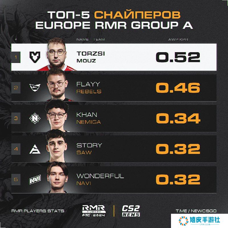 上海Major欧洲RMR A组比赛结束后,有外媒统计了本次赛事中狙击手的表现数据。其中,3-0直接晋级传奇组的MOUZ战队狙击手torzsi平均每回合狙杀数0.52位居所有参赛选手之最。而同样直通传奇组的NAVI战队狙击手w0nderful平均每回合狙杀数0.32位列第五。 以下为欧洲RMR A组平均每回合狙杀数(AWP KPR)排行榜: torzsi( MOUZ):0.52 flayy( Rebels):0.46 khaN( Nemiga):0.34 story( SAW):0.32 w0nderful( Natus Vincere):0.32