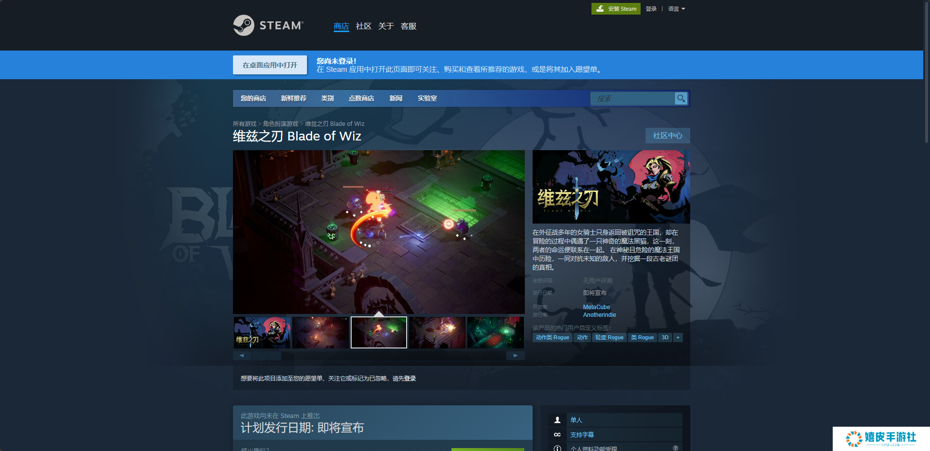 《维兹之刃》是一款非常有趣的俯视角动作肉鸽游戏,而这款游戏想要下载还是比较麻烦的,下载的第一步就是安装Steam平台,然后注册账号登录,并且搜索“维兹之刃 Blade of Wiz”,然后点击购买,之后点马上开玩即可。
