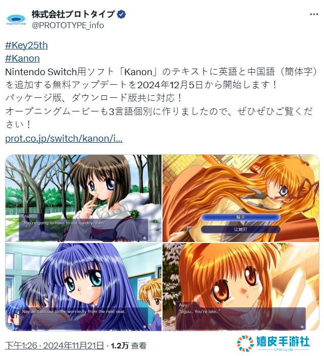 11月21日,发行商PROTOTYPE宣布,Key社经典视觉小说《Kanon》的Switch版将于12月5日添加简体中文和英文语言支持,并且游戏开场动画也新制作了简体中文版和英文版,玩家可以自行选择。