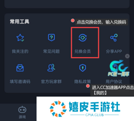 手机版兑换教程 浏览器搜索“CC加速器官网”下载安装CC加速器APP,打开后进入【我的】--【兑换会员】,输入兑换码CCJSQ999,即可兑换成功。兑换成功后会弹窗提示,玩家需退出后台APP重新进入CC加速器,进入【我的】查看会员到期时间。