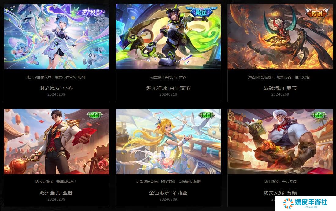 时之魔女-小乔:时之TV当家花旦,魔女小乔冒险再起! 超元猎域-百里玄策:勋章猎手勇闯超元世界 战鼓燎原-典韦:远古时代的战神,熔炼兵器,挥出火焰! 鸿运当头-亚瑟:鸿运大派送,新年财运到! 金色潮汐-朵莉亚:可爱海员登场,和朵莉亚一起扬帆起航吧 功夫炙烤-廉颇:功夫所致,专业炙烤