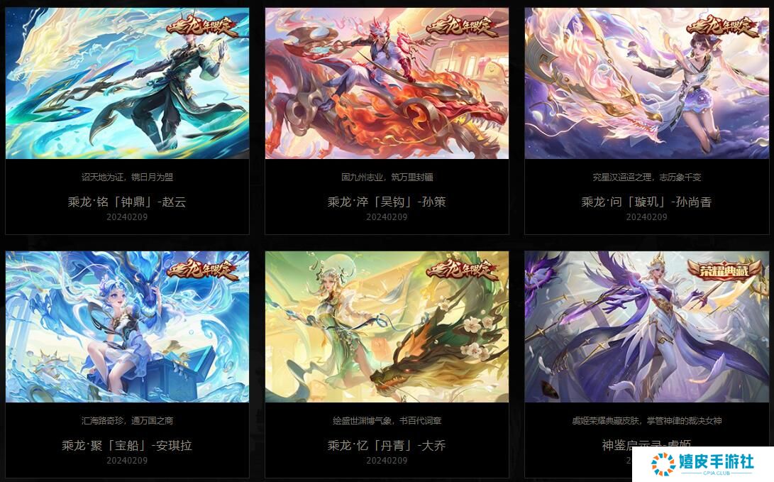 乘龙·铭「钟鼎」-赵云:诏天地为证,镌日月为盟 乘龙·淬「吴钩」孙策:九州志业,筑万里封疆 乘龙·问「璇玑」孙尚香:究星汉迢超之理,志历象千变 乘龙·聚「宝船」安琪拉:汇海路奇珍, 通万国之商 乘龙·忆「丹青」大乔:绘盛世渊博气象,书百代词章 神鉴启示录-虞姬:處姬荣耀典藏皮肤,掌管神律的裁决女神