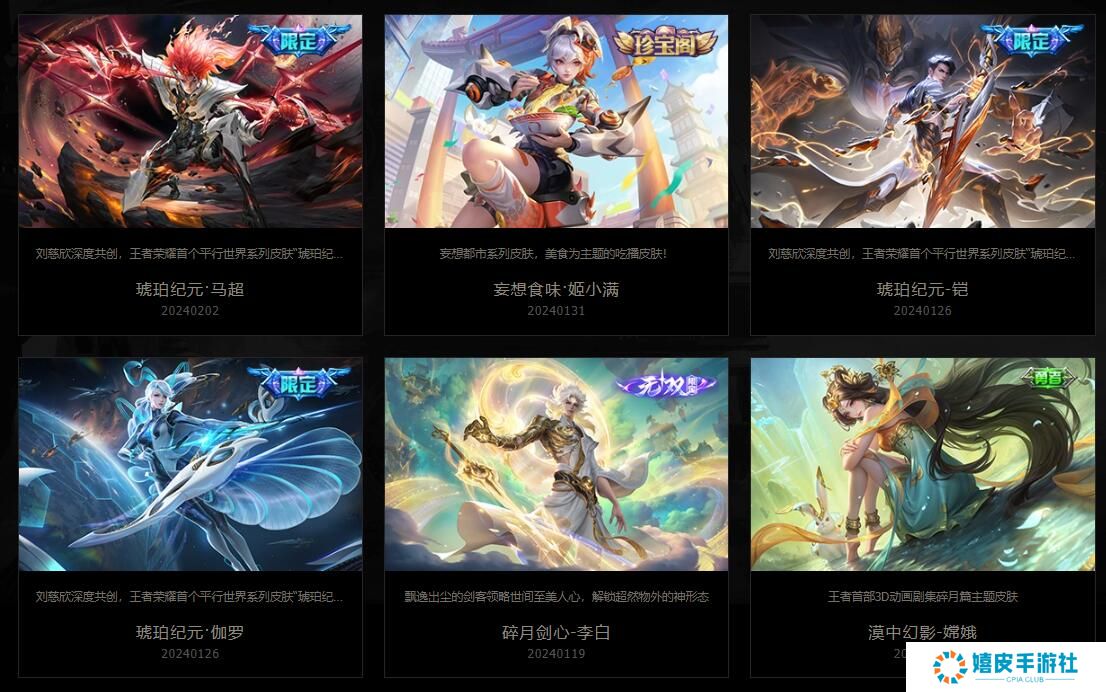 琥珀纪元马超:刘慈欣深度共创,王者荣耀首个平行世界系皮肤琥珀纪 妄想食味·姬小满:妄想都市系列皮肤,美食为主题的吃播皮肤! 琥珀纪元铠:刘慈欣深度共创,王者荣耀首个平行世界系列皮肤琥珀纪 琥珀纪元·伽罗:刘慈欣深度共创,王者荣耀首个平行世界系列皮肤琥珀纪 碎月剑心-李白:飘逸出尘的剑客领略世间至美人心,解锁超然物外的神形态 漠中幻影-嫦娥:王者首部3D动画剧集碎月篇主题皮肤