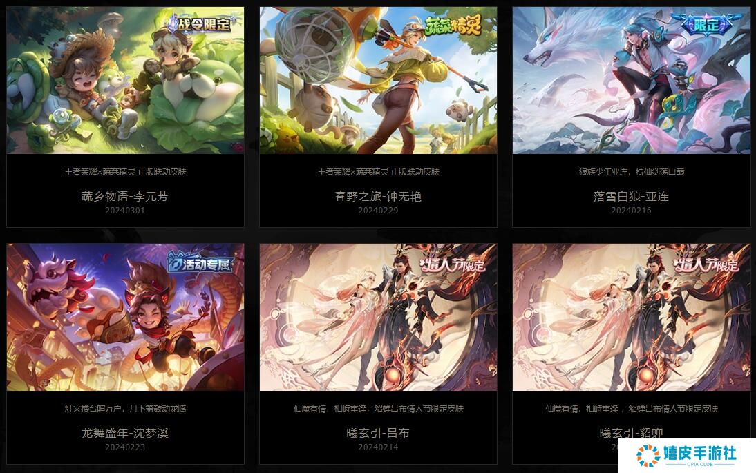 春野之旅-钟无艳:王者荣耀x蔬荣精灵正版联动皮肤 落雪白狼-亚连:狼族少年亚连,持仙剑荡山巅 龙舞盛年-沈梦溪:灯火楼台喧万户,月下箫鼓动龙腾 曦玄引-吕布:仙魔有情,相峙重逢,貂蝉吕布情人节限定皮肤