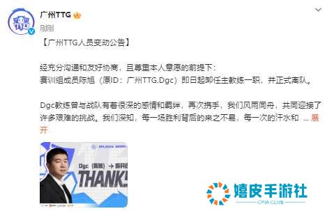 虎扑11月21日讯 广州TTG人员变动公告:Dgc即日起卸任主教练,并正式离队 原文如下: 【广州TTG人员变动公告】经充分沟通和友好协商,且尊重本人意愿的前提下:赛训组成员陈旭(原ID:广州TTG.Dgc)即日起卸任主教练一职,并正式离队。Dgc教练曾与战队有着很深的感情和羁绊,再次携手,我们风雨同舟,共同迎接了许多艰难的挑战。我们深知,每一场胜利背后的来之不易,每一次的汗水和努力都不可磨灭,也明白前路荆棘丛生,但这一路走来我们从未想过要放弃。在Dgc教练执教期间,他一直苦心钻研战术,认真负责,凭借自己丰富的执教经验,为团队注入能量。我们在此衷心感谢Dgc教练在执教期间的付出和不辞辛劳,尽管前方是一条分岔路口,但也祝愿Dgc教练未来前程似锦,鹏程万里!