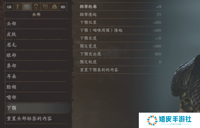 9、下颚:腮帮轮廓-9、腮帮隆起29、下颚位置-100、下颚(咽喉周围)隆起-100、下预长度-31、颚尖宽度-100、下预突出度100、颚尖锐度0