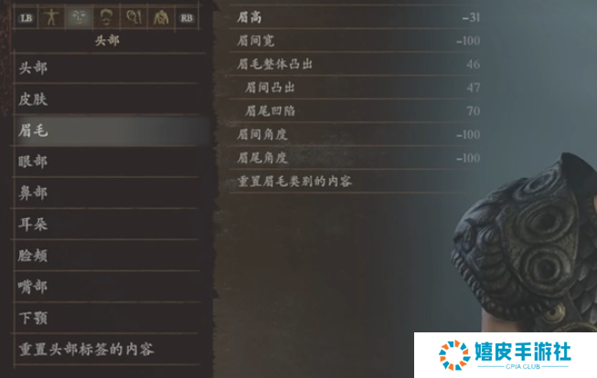 3、眉毛:眉高-31、眉间宽-100、眉毛整体凸出46、眉间凸出47、眉尾凹陷70、眉间角度-100、眉尾角度-100