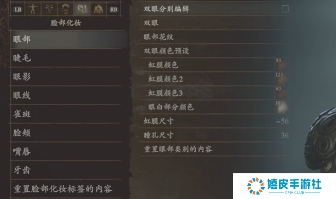 1、眼部:虹膜颜色93、虹膜顏色123 、虹膜颜色63、眼白部分颜色107 、虹膜尺寸-56、瞳孔尺寸36