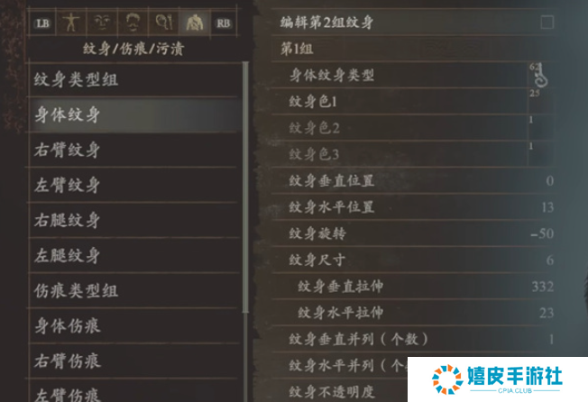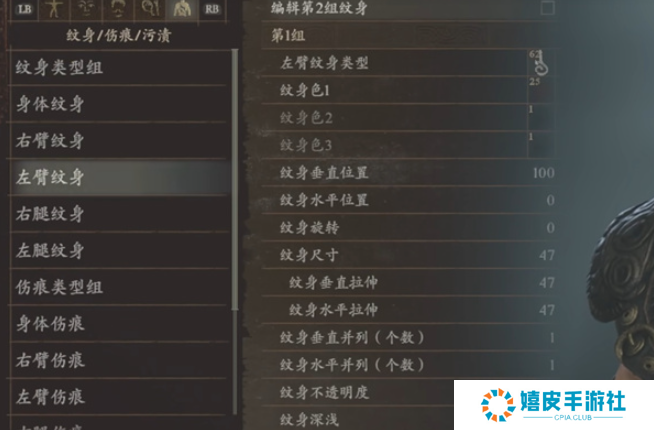 3、左臂纹身:身体纹身类型62、纹身色25、纹身垂直位置100、纹身水平位置0、纹身旋转0、纹身尺寸47、纹身垂直拉伸47、纹身水平拉伸47、纹身垂直并列(个数)1、纹身水平并列(个数)1、纹身不透明度100