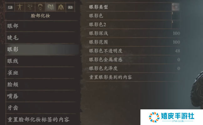 3、眼影:眼影色1、眼影色1、眼影深浅100、眼影范围100、眼影色不透明度48、眼影色金属质感0、眼影色光泽度0、眼影类型4