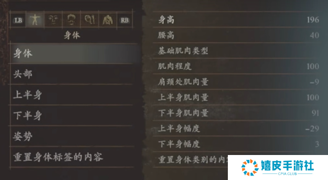 1、身体:身高196、腰高40、肌肉程度100、肩頸处肌肉量-9、上半身肌肉量100、下半身肌肉量91、上半身幅度-29、下半身幅度3